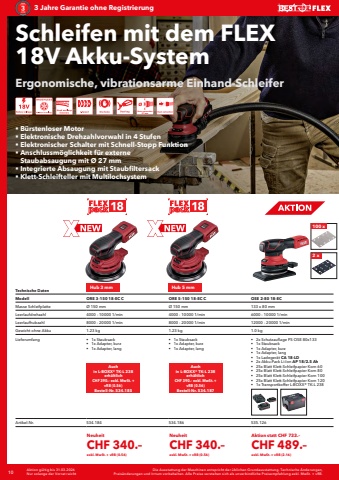 10 Die Ausstattung der Maschinen entspricht der %u00fcblichen Grundausstattung. Technische %u00c4nderungen, Preis%u00e4nderungen und Irrtum vorbehalten. Alle Preise verstehen sich als unverbindliche Preisempfehlung exkl. MwSt. + vRB.Aktion g%u00fcltig bis 31.03.2026Nur solange der Vorrat reicht3 Jahre Garantie ohne RegistrierungTechnische DatenModell ORE 3-150 18-EC C ORE 5-150 18-EC C OSE 2-80 18-ECMasse Schleifplatte %u00d8 150 mm %u00d8 150 mm 133 x 80 mmLeerlaufdrehzahl 4000 - 10000 1/min 4000 - 10000 1/min 6000 - 10000 1/minLeerlaufhubzahl 8000 - 20000 1/min 8000 - 20000 1/min 12000 - 20000 1/minGewicht ohne Akku 1.23 kg 1.23 kg 1.0 kgLieferumfang %u0083 1x Staubsack%u0083 1x Adapter, kurz%u0083 1x Adapter, lang%u0083 1x Staubsack%u0083 1x Adapter, kurz%u0083 1x Adapter, lang%u0083 2x Schutzauflage PS OSE 80x133%u0083 1x Staubsack%u0083 1x Adapter, kurz%u0083 1x Adapter, lang%u0083 1x Ladeger%u00e4t CA 18-LD%u0083 2x Akku-Pack Li-Ion AP 18/2.5 Ah%u0083 25x Blatt Klett-Schleifpapier Korn 60%u0083 25x Blatt Klett-Schleifpapier Korn 80%u0083 25x Blatt Klett-Schleifpapier Korn 100%u0083 25x Blatt Klett-Schleifpapier Korn 120%u0083 1x Transportkoffer L-BOXX%u00ae TK-L 238Artikel-Nr. 534.184 534.186 535.126%u0083 B%u00fcrstenloser Motor%u0083 Elektronische Drehzahlvorwahl in 4 Stufen%u0083 Elektronischer Schalter mit Schnell-Stopp Funktion%u0083 Anschlussm%u00f6glichkeit f%u00fcr externe Staubabsaugung mit %u00d8 27 mm%u0083 Integrierte Absaugung mit Staubfiltersack%u0083 Klett-Schleifteller mit MultilochsystemErgonomische, vibrationsarme Einhand-Schleifer Schleifen mit dem FLEX 18V Akku-SystemHose connection 27 mmAuch in L-BOXX%u00ae TK-L 238erh%u00e4ltlich CHF 390.%u2013 exkl. MwSt. + vRB (0.56)Bestell-Nr. 534.185Auch in L-BOXX%u00ae TK-L 238erh%u00e4ltlich CHF 390.%u2013 exkl. MwSt. + vRB (0.56)Bestell-Nr. 534.187100 x 2 x Aktion statt CHF 733.%u2013CHF 489.%u2013exkl. MwSt. + vRB (2.16)NeuheitCHF 340.%u2013exkl. MwSt. + vRB (0.56)NeuheitCHF 340.%u2013exkl. MwSt. + vRB (0.56)Hub 3 mm Hub 5 mm