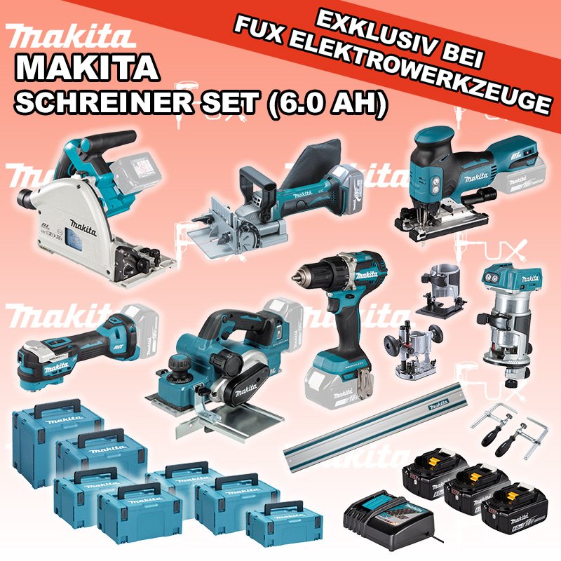 Zu "Akku Maschinen SET 18 Volt" von Makita FUX SPECIAL EXKLUSIV BEI FUX Makita 7-teiliges Schreiner Set 7 (6.0 Ah) Bestell- und Artikelnummer: Schreiner Set 7 DSP601ZJU Eintauch-KreissägeAkkuspannung 2 x 18 V Sägeblatt (Ø) 165 mm Schnitttiefe bei 90° 56 mm Gewicht (EPTA) 5.1 kg Infos DTM52Z Multifunktions WerkzeugAkkuspannung 18 V Schwingungen 10000 - 20000 min-1 Werkzeugaufnahme Starlock Max System Gewicht inkl. Akku 2.0 kg Infos DJV18ZJ Akku-StichsägeAkkuspannung 18 V Hubzahl 800 - 3500/ min Schnittleistung Holz 135 mm / Stahl 10 mm Gewicht 2.5 kgInfos DRT50ZJX11 Akku-Einhandfräse / Kantenfräse Akkuspannung 18 V Leerlaufdrehzahl 10000 - 30000 min-1 Tiefeneinstellung bis 40 mm Gewicht 2.0 kgInfos DDF484ZJ Akku-BohrschrauberAkkuspannung 18 V Drehzahlen 0-500 / 0-2000 U/min Drehmoment hart / weich 54 / 30 Nm Gewicht 1.5 kgInfos DKP181ZJ Akku-Einhand-HobelAkkuspannung 18 V Hobelbreite 82 mm Spanabnahme stufenlos 0 - 3 mm Gewicht inkl. Akku 3.6 kgInfos DPJ180ZJ Akku-Universal-NutfräseAkkuspannung 18 V Leerlaufdrehzahl 6500 min-1 Fräserdurchmesser 100 mm Gewicht inkl. Akku 3.3 kgInfos 3 x BL 1860 B ( Li-Ion Akku )18 V 6.0 Ah ( Li-Ion Akku ) Infos DC 18 RC Schnell-Ladegerätfür Akkus 14.4 - 18 Volt ( Li-Ion Akkus )Infos Führungsschiene L = 140 cmgeeignet für SP6000 Handkreissäge mit passenden Adapter Auch für weitere Handkreissägen und Stichsägen geeignet mit passendem Adapter. ( 194579-2 )Infos 194385-5 Schraubzwingen für Führungsschienen2 Schraubzwingen für FührungsschienenInfos MAKPAC Gr. 3Produktabmessung (L x B x H) 377 x 277 x 176 mm Infos Einsatz für DTM52 Einsatz für DTM52 Makpac Koffer Typ C (821551-8) Infos Standard-Ausrüstung In diesem Set enthalten: DSP601ZJU Eintauch-Kreissäge DTM52Z Multifunktions Werkzeug DJV18ZJ Akku-Stichsäge DRT50ZJX11 Akku-Einhandfräse / Kantenfräse DDF484ZJ Akku-Bohrschrauber DKP181ZJ Akku-Einhand-Hobel DPJ180ZJ Akku-Universal-Nutfräse 3 x BL 1860 B ( Li-Ion Akku ) DC 18 RC Schnell-Ladegerät Führungsschiene L = 140 cm 194385-5 Schraubzwingen für Führungsschienen MAKPAC Gr. 3 Einsatz für DTM52 Zubehör Listenpreis CHF 3'343.00 Fuxpreis CHF 2'129.00 inkl. 8.1% MwSt, inkl vRG Frankolieferung Kein Grauimport! Produkt bestellen 1 Stück 2 Stück 3 Stück 4 Stück 5 Stück 6 Stück 7 Stück 8 Stück 9 Stück 10 Stück Option: Makita BL 1860 B ( Li-lon Akku ) für CHF 95.- statt CHF 124.-Infos Alle Angaben ohne Gewähr und solange Vorrat reicht!Wiederverkäufer werden? Produkt als PDF NEUHEITAKTION 36%