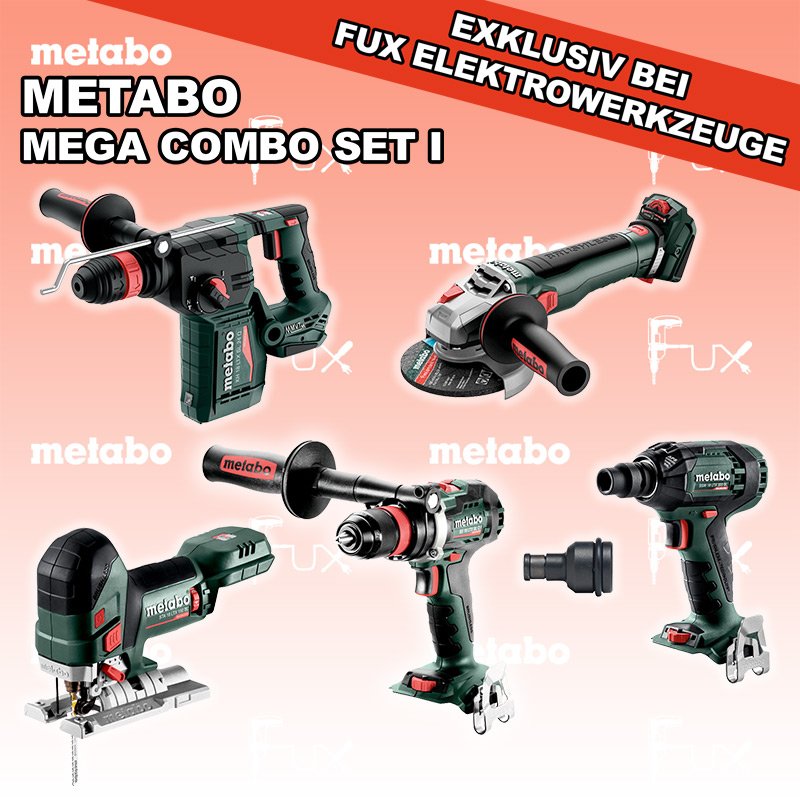 Das Ladenlokal bleibt vom 25. Dezember 2025 bis am 04. Januar 2026 geschlossen. Bestellungen und Lieferungen von Neugeräten werden trotz Ferienabwesenheit in gewohnter Fux-Manier entgegengenommen und ausgeliefert. Heute auf dieses Produkt 44% Rabatt! Zu "Combo Set 18 Volt " von Metabo FULL Service: 36 Monate zum Nulltarif für Sie! Weitere Infos zum FULL Service Dieses Produkt ist CAS kompatibel! Weitere Infos zu CAS Sparfux Aktionen FUX SPECIAL EXKLUSIV BEI FUX Metabo Mega Combo Set 1 SOLO Bestell- und Artikelnummer: Mega Combo Set 1 SOLO STA 18 LTX 150 BL Akku-StichsägeAkkuspannung 18 V Hubzahl 1.000-3.500 /min Gewicht ohne Akkupack 1.9 kgInfos KH 18 LTX BL 24 Q Akku-KombihammerAkkuspannung 18 V Einzelschlagstärke 2.2 J Bohrleistung in Beton 24 mm Gewicht ohne Akkupack 3 kgInfos BS 18 LTX BL Q I Akku-BohrschrauberAkkuspannung 18 V Drehzahl 0-550 / 0-2000 U/min Drehmoment hart / weich 130 / 65 Nm Gewicht (mit Akkupack) 2.3 kgInfos WVB 18 LT BL 11-125 Quick Akku-WinkelschleiferAkkuspannung 18 V Drehzahl 2.800 - 10.000 / min Ø 125 mm Scheiben Gewicht (mit Akkupack) 2.5 kgInfos SSW 18 LTX 300 BL Akku-SchlagschrauberAkkuspannung 18 V Anziehdrehmoment 300 Nm Werkzeugaufnahme 1/2" Gewicht 1.7 kgInfos Reduktions Adapter 1/2" auf 1/4" Aufnahme Max. 350 Nm Länge 45 mmInfos Registriere die in diesem Set vorhandenen Metabo Maschinen auf metabo.ch, und ergattere dir bis zu 5 Gratis Akkus!Zusätzlich offerieren wir zu diesem Set einen Gratis Akku!OHNE AKKUS UND LADEGERÄT Standard-Ausrüstung In diesem Set enthalten: STA 18 LTX 150 BL Akku-Stichsäge KH 18 LTX BL 24 Q Akku-Kombihammer BS 18 LTX BL Q I Akku-Bohrschrauber WVB 18 LT BL 11-125 Quick Akku-Winkelschleifer SSW 18 LTX 300 BL Akku-Schlagschrauber Reduktions Adapter Zubehör Verbrauchsmaterial Listenpreis CHF 1'780.00 Fuxpreis CHF 984.00 inkl. 8.1% MwSt, inkl vRG Frankolieferung Kein Grauimport! Produkt bestellen 1 Stück 2 Stück 3 Stück 4 Stück 5 Stück 6 Stück 7 Stück 8 Stück 9 Stück 10 Stück Alle Angaben ohne Gewähr und solange Vorrat reicht!Wiederverkäufer werden? Produkt als PDFVideo LiHD 1Video LiHD 2 AKTION 44%