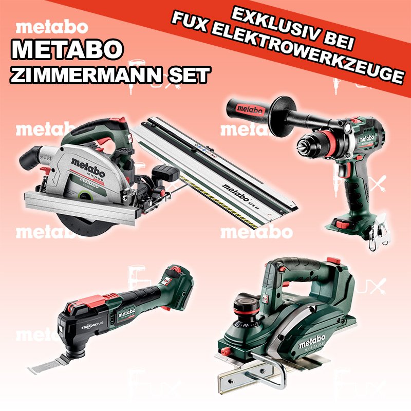 Das Ladenlokal bleibt vom 25. Dezember 2025 bis am 04. Januar 2026 geschlossen. Bestellungen und Lieferungen von Neugeräten werden trotz Ferienabwesenheit in gewohnter Fux-Manier entgegengenommen und ausgeliefert. Heute auf dieses Produkt 27% Rabatt! Zu "Zimmermann Set" von Metabo FULL Service: 36 Monate zum Nulltarif für Sie! Weitere Infos zum FULL Service Dieses Produkt ist CAS kompatibel! Weitere Infos zu CAS Sparfux Aktionen FUX SPECIAL EXKLUSIV BEI FUX Metabo Zimmermann SET 6 SOLO Bestell- und Artikelnummer: Zimmermann SET 6 SOLO BS 18 LTX BL Q I Akku-BohrschrauberAkkuspannung 18 V Drehzahl 0-550 / 0-2000 U/min Drehmoment hart / weich 130 / 65 Nm Gewicht (mit Akkupack) 2.3 kgInfos MT 18 LTX BL QSL Akku-Multitool Akkuspannung 18 V Schwingzahl bei Leerlauf 8.000 - 20.000 /min Schleifplatte, Maß Eck zu Eck 93 mm Gewicht 1.7 kgInfos HO 18 LTX 20-82 Akku-Einhand-HobelAkkuspannung 18 V Hobelbreite 82 mm Spanabnahme einstellbar 0-2 mm Gewicht 3.5 KgInfos KS 18 LTX 66 BL Akku HandkreissägeAkkuspannung 18 V Schnitt-Tiefe bei 90° 0-66 mm Sägeblatt 165 mm Gewicht 4.5 kgInfos Kappschiene KFS 44Gesamtlänge 834 mm Schnittlänge 440 mmInfos Registriere die in diesem Set vorhandenen Metabo Maschinen auf metabo.ch, und ergattere dir bis zu 5 Gratis Akkus!Zusätzlich offerieren wir zu diesem Set einen Gratis Akku!OHNE AKKUS UND LADEGERÄT Standard-Ausrüstung In diesem Set enthalten: BS 18 LTX BL Q I Akku-Bohrschrauber MT 18 LTX BL QSL Akku-Multitool HO 18 LTX 20-82 Akku-Einhand-Hobel KS 18 LTX 66 BL Akku Handkreissäge Kappschiene KFS 44 Listenpreis CHF 1'564.50 Fuxpreis CHF 1'131.00 inkl. 8.1% MwSt, inkl vRG Versand CHF 25.00 Kein Grauimport! Produkt bestellen 1 Stück 2 Stück 3 Stück 4 Stück 5 Stück 6 Stück 7 Stück 8 Stück 9 Stück 10 Stück Alle Angaben ohne Gewähr und solange Vorrat reicht!Wiederverkäufer werden? Produkt als PDF NEUHEITAKTION 27%