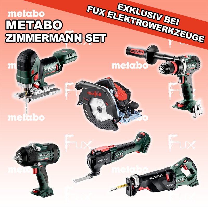 Das Ladenlokal bleibt vom 25. Dezember 2025 bis am 04. Januar 2026 geschlossen. Bestellungen und Lieferungen von Neugeräten werden trotz Ferienabwesenheit in gewohnter Fux-Manier entgegengenommen und ausgeliefert. Heute auf dieses Produkt 21% Rabatt! Zu "Zimmermann Set" von Metabo FULL Service: 36 Monate zum Nulltarif für Sie! Weitere Infos zum FULL Service Dieses Produkt ist CAS kompatibel! Weitere Infos zu CAS Sparfux Aktionen FUX SPECIAL EXKLUSIV BEI FUX Metabo Zimmermann SET 14 SOLO Bestell- und Artikelnummer: Zimmermann SET 14 SOLO BS 18 LTX BL Q I Akku-BohrschrauberAkkuspannung 18 V Drehzahl 0-550 / 0-2000 U/min Drehmoment hart / weich 130 / 65 Nm Gewicht (mit Akkupack) 2.3 kgInfos SSW 18 LTX 1450 BL Akku-SchlagschrauberAkkuspannung 18 V Anziehdrehmoment 1450 Nm Werkzeugaufnahme 1/2" Infos SSEP 18 LTX BL MVT Akku-SäbelsägeAkkuspannung 18 V Hubzahl bei Leerlauf 0 - 3.000 /min Gewicht (mit Akkupack) 4.6 kgInfos K 85 - 18 PURE Akku-Handkreissägen im L-MAXSchnitttiefe 0 – 88 mm Schnitttiefe bei 45° 0 – 61.5 mm Gewicht (mit Akku) 8.1 kgInfos MT 18 LTX BL QSL Akku-Multitool Akkuspannung 18 V Schwingzahl bei Leerlauf 8.000 - 20.000 /min Schleifplatte, Maß Eck zu Eck 93 mm Gewicht 1.7 kgInfos STA 18 LTX 150 BL Akku-StichsägeAkkuspannung 18 V Hubzahl 1.000-3.500 /min Gewicht ohne Akkupack 1.9 kgInfos Registriere die in diesem Set vorhandenen Metabo Maschinen auf metabo.ch, und ergattere dir bis zu 5 Gratis Akkus!Zusätzlich offerieren wir zu diesem Set einen Gratis Akku!OHNE AKKUS UND LADEGERÄT Standard-Ausrüstung In diesem Set enthalten: BS 18 LTX BL Q I Akku-Bohrschrauber SSW 18 LTX 1450 BL Akku-Schlagschrauber SSEP 18 LTX BL MVT Akku-Säbelsäge K 85 - 18 PURE Akku-Handkreissägen im L-MAX MT 18 LTX BL QSL Akku-Multitool STA 18 LTX 150 BL Akku-Stichsäge Listenpreis CHF 3'161.20 Fuxpreis CHF 2'497.00 inkl. 8.1% MwSt, inkl vRG Versand CHF 25.00 Kein Grauimport! Produkt bestellen 1 Stück 2 Stück 3 Stück 4 Stück 5 Stück 6 Stück 7 Stück 8 Stück 9 Stück 10 Stück Alle Angaben ohne Gewähr und solange Vorrat reicht!Wiederverkäufer werden? Produkt als PDF NEUHEITAKTION 21%