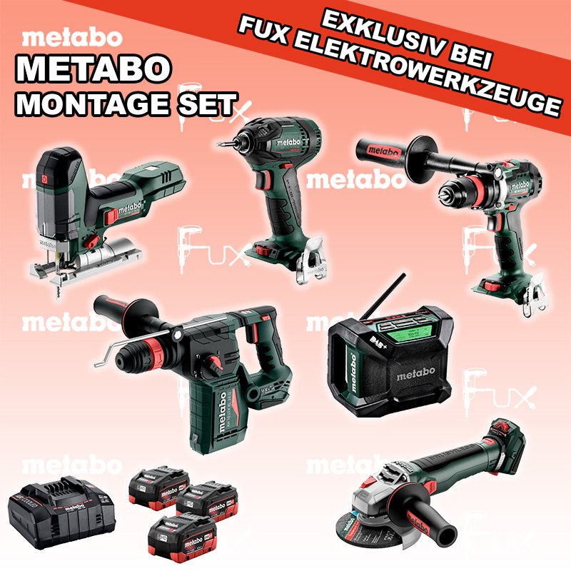 Zu "Montage Set" von Metabo FULL Service: 36 Monate zum Nulltarif für Sie! Weitere Infos zum FULL Service Dieses Produkt ist CAS kompatibel! Weitere Infos zu CAS FUX SPECIAL EXKLUSIV BEI FUX Metabo Montage Set 7 Bestell- und Artikelnummer: meMontage Set 7 ST 18 LT 130 BL Akku-StichsägeAkkuspannung 18 V Hubzahl 1000-3.500 /min Gewicht ohne Akkupack 1.5 kgInfos KH 18 LTX BL 24 Q Akku-KombihammerAkkuspannung 18 V Einzelschlagstärke 2.2 J Bohrleistung in Beton 24 mm Gewicht ohne Akkupack 3 kgInfos WB 18 LTX BL 15-125 Quick Akku-Winkelschleifer Akkuspannung 18 V so stark wie ein 1500 Watt Netzgerät Drehzahl 10000 U / min Ø 125 mm Scheiben Gewicht mit Akkupack 2,7 kgInfos SSD 18 LTX 200 BL Akku-Schlagschrauber Akkuspannung 18 V Anziehdrehmoment 200 Nm Werkzeugaufnahme 1/4" Gewicht 1.3 kgInfos R 12-18 DAB+ BT Akku-BaustellenradioDAB+ Akkuspannung 12 V / 18 V Extreme Akkupacks mit 14,4 und 18 Volt Gewicht 1.85 kgInfos BS 18 LTX BL Q I Akku-BohrschrauberAkkuspannung 18 V Drehzahl 0-550 / 0-2000 U/min Drehmoment hart / weich 130 / 65 Nm Gewicht (mit Akkupack) 2.3 kgInfos 3 x 18 V, 5.5 Ah, LiHD Akkupack18 V 5.5 Ah ( LiHD Akkus ) Infos ASC 145, 12 - 36 V "Air Cooled" LadegerätZum Aufladen aller Li-Power Schiebesitz-Akkupacks (12 V - 36 V). Ladestrom 8.0 AInfos Registriere die in diesem Set vorhandenen Metabo Maschinen auf metabo.ch, und ergattere dir bis zu 5 Gratis Akkus!Zusätzlich offerieren wir zu diesem Set einen Gratis Akku! Standard-Ausrüstung In diesem Set enthalten: ST 18 LT 130 BL Akku-Stichsäge KH 18 LTX BL 24 Q Akku-Kombihammer WB 18 LTX BL 15-125 Quick Akku-Winkelschleifer SSD 18 LTX 200 BL Akku-Schlagschrauber R 12-18 DAB+ BT Akku-Baustellenradio BS 18 LTX BL Q I Akku-Bohrschrauber 3 x 18 V, 5.5 Ah, LiHD Akkupack ASC 145, 12 - 36 V "Air Cooled" Ladegerät Zubehör Verbrauchsmaterial Listenpreis CHF 2'286.00 Fuxpreis CHF 1'372.00 inklusive 8.1% MwSt Versand CHF 40.00 Kein Grauimport! Produkt bestellen 1 Stück 2 Stück 3 Stück 4 Stück 5 Stück 6 Stück 7 Stück 8 Stück 9 Stück 10 Stück Alle Angaben ohne Gewähr und solange Vorrat reicht!Wiederverkäufer werden? Produkt als PDFVideo LiHD 1Video LiHD 2 NEUHEITAKTION 40%