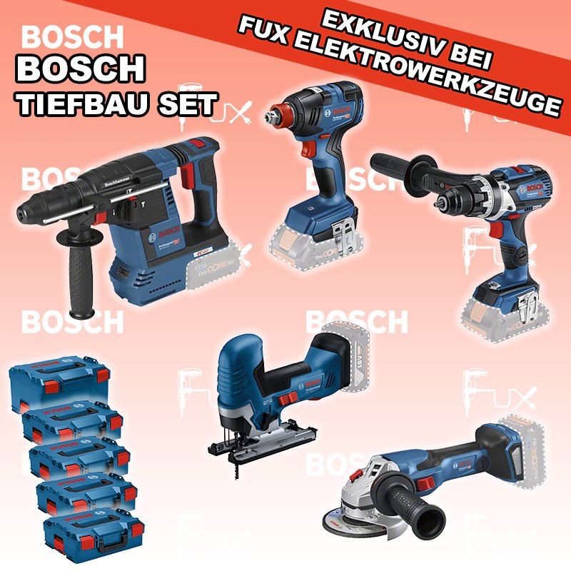 Zu "Bau / Tiefbau Set" von Bosch Professional FUX SPECIAL EXKLUSIV BEI FUX Bosch Professional Tiefbau Set 1 SOLO Bestell- und Artikelnummer: BOTiefbau Set 1 SOLO GSR 18V-110 C Akku-BohrschrauberAkkuspannung 18 V Drehzahlen 0-480 / 0-2100 U/min Drehmoment weich / hart / max. 47 / 85 / 110 Nm Gewicht 2.2 kgInfos GST 18V-125 S Akku-StichsägeAkkuspannung 18 V Hubzahl bei Leerlauf 500 - 3500 min⁻¹ Hubhöhe 26 mm Gewicht exkl. Akku 1.9 kgInfos GBH 18V-26 F Akku-BohrhammerAkkuspannung 18 V Einzelschlagstärke 2.6 J Bohrleistung in Beton 4 - 26 mm Gewicht Netto 3.0 kgInfos GDX 18V-200 Akku-DrehschlagschrauberAkkuspannung 18 V Anziehdrehmoment 200 Nm Werkzeugaufnahme 1/2" & 1/4" Gewicht 1.2 kgInfos GWS 18V-15 C Akku-Winkelschleifer BiturboAkkuspannung 18 V Leerlaufdrehzahl 11000 U / min 125 mm Scheiben Gewicht inkl. Akku 3.2 kg Infos OHNE AKKUS UND LADEGERÄT Standard-Ausrüstung In diesem Set enthalten: GSR 18V-110 C Akku-Bohrschrauber GST 18V-125 S Akku-Stichsäge GBH 18V-26 F Akku-Bohrhammer GDX 18V-200 Akku-Drehschlagschrauber GWS 18V-15 C Akku-Winkelschleifer Biturbo Geliefert im Koffer Zubehör Listenpreis CHF 1'650.00 Fuxpreis CHF 1'239.00 inklusive 8.1% MwSt Frankolieferung Kein Grauimport! Produkt bestellen 1 Stück 2 Stück 3 Stück 4 Stück 5 Stück 6 Stück 7 Stück 8 Stück 9 Stück 10 Stück Alle Angaben ohne Gewähr und solange Vorrat reicht! Produkt als PDF NEUHEITAKTION 24%