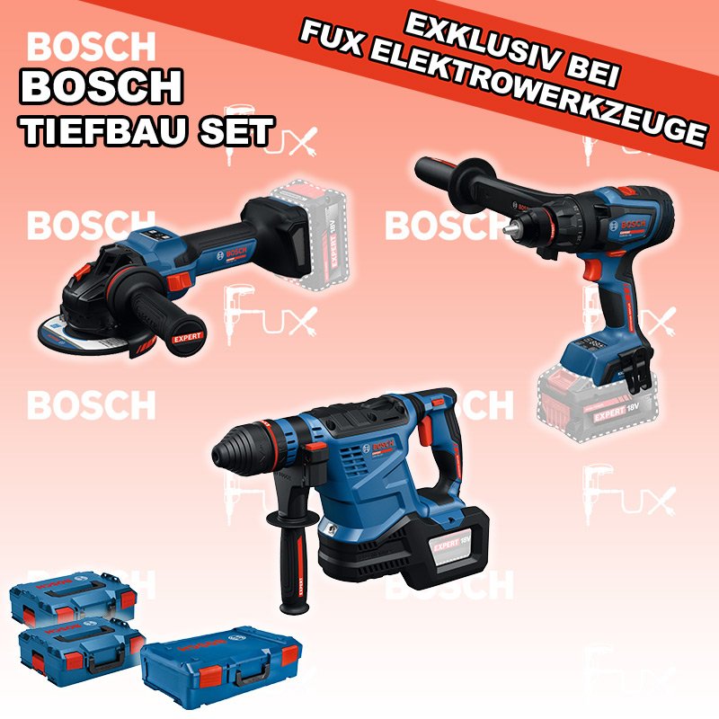 Das Ladenlokal bleibt vom 23. Februar 2026 bis am 28. Februar 2026 geschlossen. Bestellungen und Lieferungen von Neugeräten werden trotz Ferienabwesenheit in gewohnter Fux-Manier entgegengenommen und ausgeliefert. Zu "Bau / Tiefbau Set" von Bosch Professional FUX SPECIAL EXKLUSIV BEI FUX Bosch Expert EXTiefbau Set 5 SOLO Bestell- und Artikelnummer: EXTiefbau Set 5 SOLO 5 Jahre Garantie auf Bosch Expert Maschinen EXSR18V-150 Akku-BohrschrauberAkkuspannung 18 V Drehmoment 84 / 100 / 150 Nm Leerlaufdrehzahl 0 – 550 / 0 – 2200 min⁻¹ Gewicht exkl. Akku 2.1 kgInfos EXBH18V-32F Akku-BohrhammerAkkuspannung 18 V Nenn-Schlagenergie 4.5 J Schlagzahl bei Nenndrehzahl 4300 bpm Nenndrehzahl 0 – 790 min⁻¹ Gewicht exkl. Akku 4.2 kgInfos EXWS18V-15S Akku-WinkelschleiferAkkuspannung 18 V Leerlaufdrehzahl 11000 min⁻¹ Scheiben-Ø 125 mm Gewicht exkl. Akku 2.2 kgInfos OHNE AKKUS UND LADEGERÄT Standard-Ausrüstung In diesem Set enthalten: EXSR18V-150 Akku-Bohrschrauber EXBH18V-32F Akku-Bohrhammer EXWS18V-15S Akku-Winkelschleifer Geliefert im Koffer Zubehör Listenpreis CHF 1'470.80 Fuxpreis CHF 1'176.00 inklusive 8.1% MwSt Kostenloser Versand Kein Grauimport! Produkt bestellen 1 Stück 2 Stück 3 Stück 4 Stück 5 Stück 6 Stück 7 Stück 8 Stück 9 Stück 10 Stück Alle Angaben ohne Gewähr und solange Vorrat reicht! Produkt als PDF NEUHEITAKTION 20%